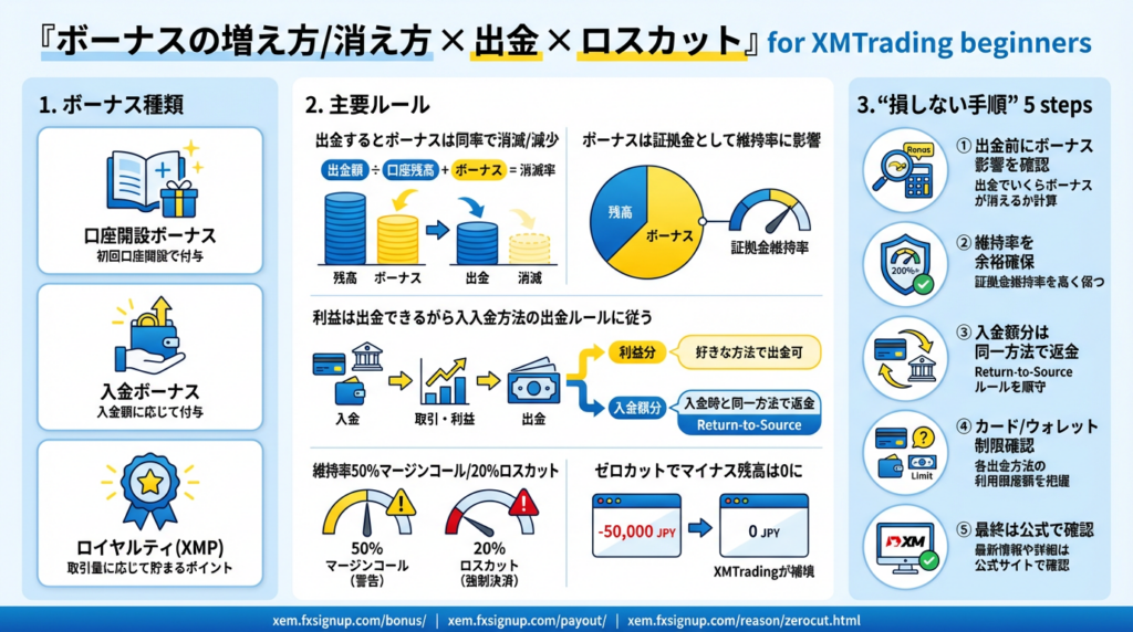 この記事では、ボーナスの増え方/消え方を軸に、出金時の扱いと、ロスカット(維持率50%/20%)・ゼロカットまでを、初心者向けに総整理します。