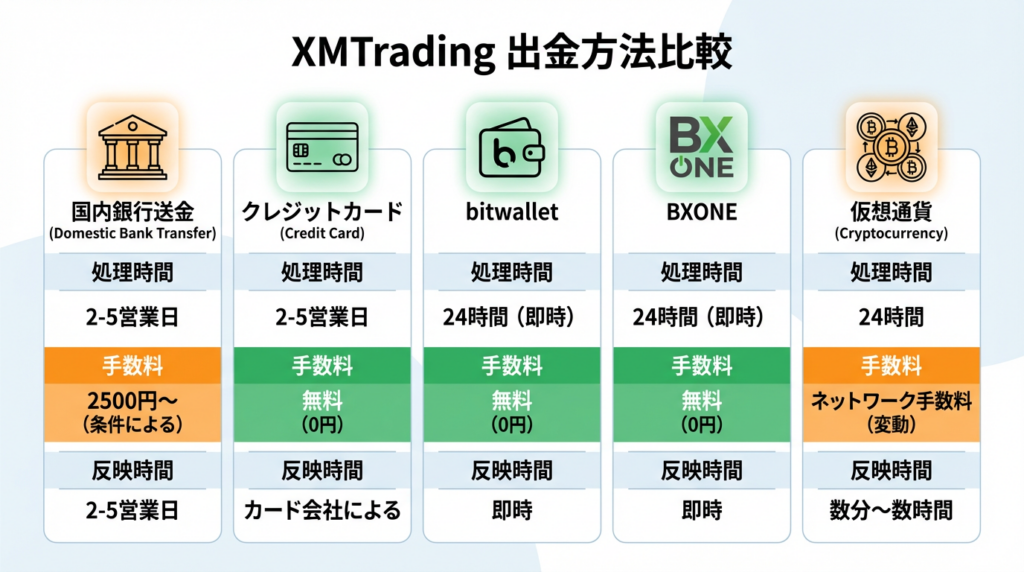 XMでは、2025年12月現在、以下の5つの出金方法が利用できます。