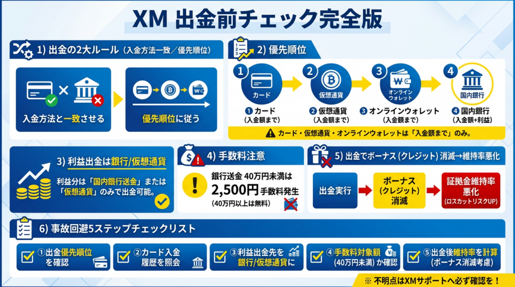 XMの“出金前チェック”完全版|出金ルート・優先順位・手数料・ボーナス減額を事故らず通す