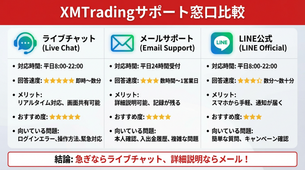 XMTradingでは、日本語対応のサポート窓口が3つ用意されています。それぞれの特徴を理解して、状況に応じて使い分けましょう。